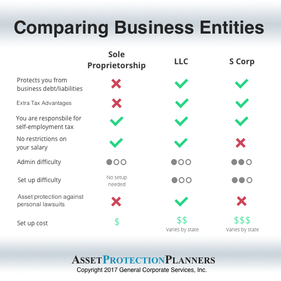 Sources: https://www.llcuniversity.com/llc-vs-sole-proprietorship-vs-corporation/ and https://www.thebalancesmb.com/starting-a-small-business-4161641